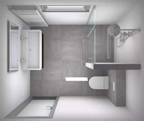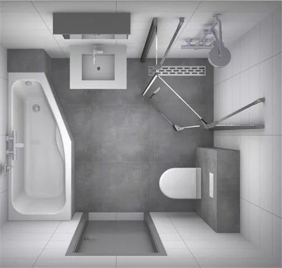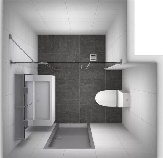 过于窄小的厕所空间需要小心死角空间浪费,所有家具围绕入门动线环绕展开安放,门的开向尽量避开使用频繁的洗手台和马桶区域。如果空间实在紧凑,可以考虑去除个别器具,如落地置物柜,坐浴器,浴缸等。